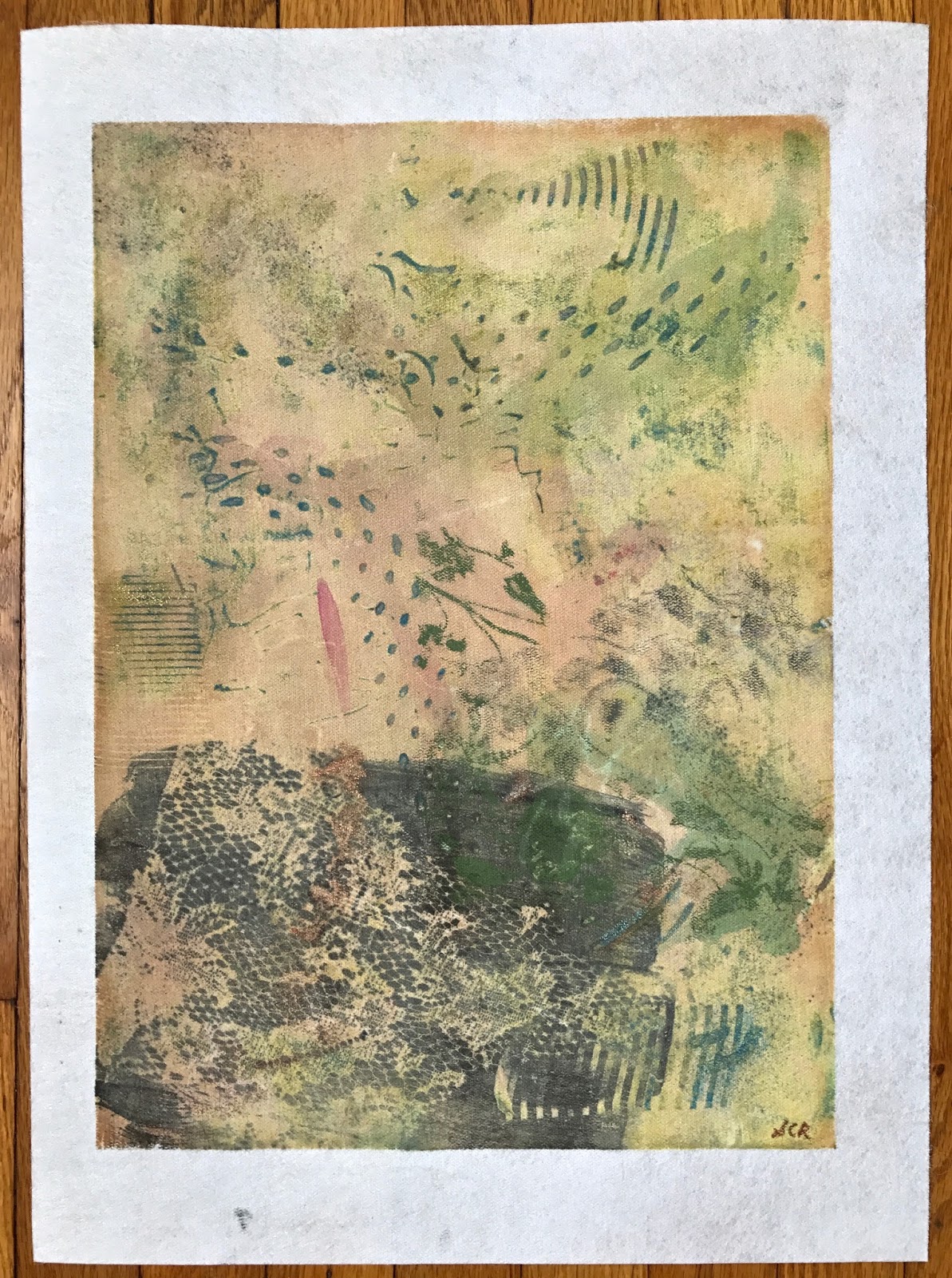 The mylar image of my photograph that was used to make the silk screen is here collaged to a clay monoprint:
