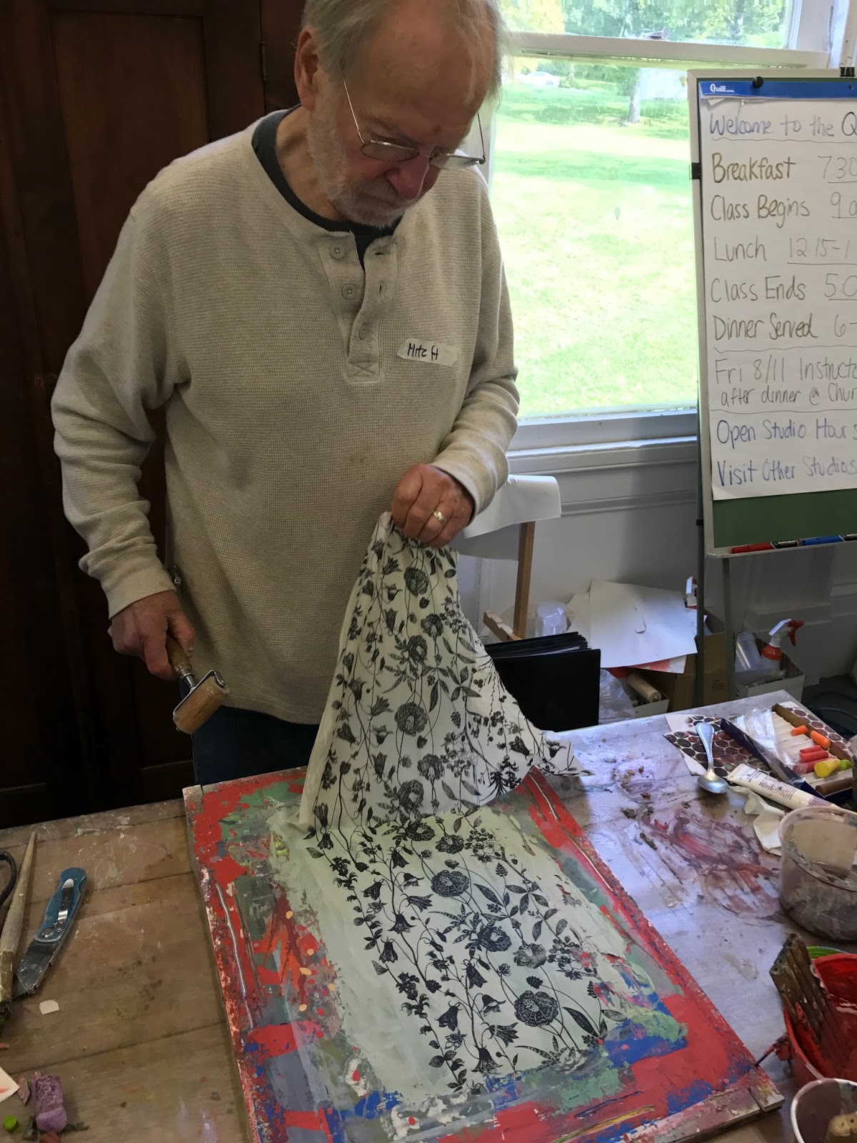 I went there to spend the long Labor Day weekend making clay monoprints with Mitch Lyons, shown above with Autumn, our Fellow and a recent MFA graduate. Mitch is the iconic pioneer of clay monoprinting who originated, explored, and developed it. He continues to explore all the time; clay monoprinting continues to develop. All of us who do it learned it from him or from someone who learned it from him. I get a kick out of how he wears his pony roller, the tool that hand presses the print, in a holster on his tool belt.